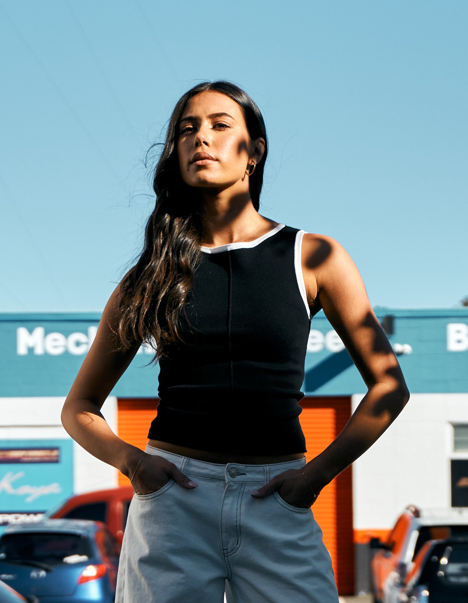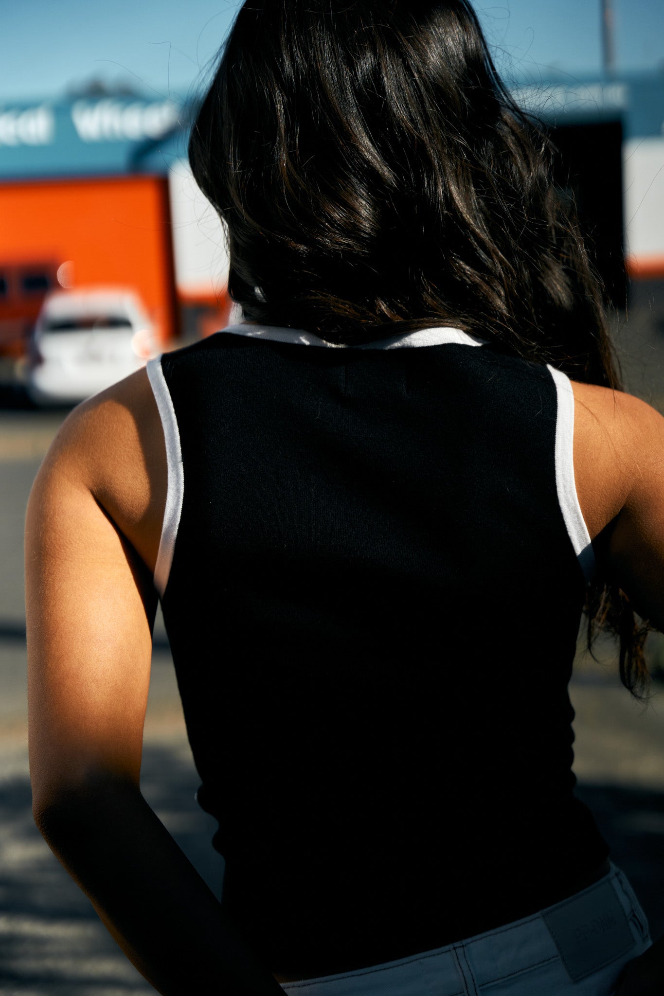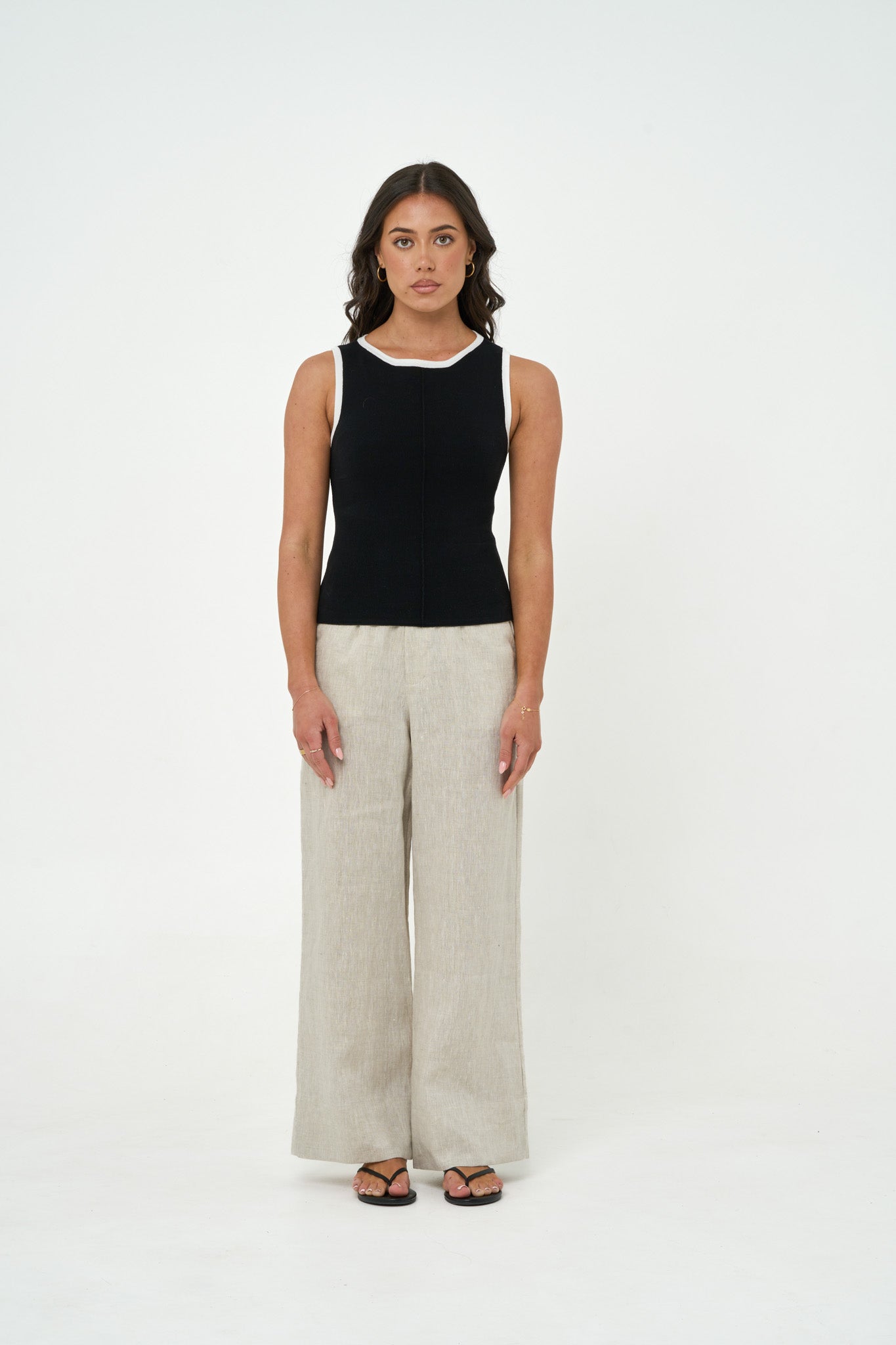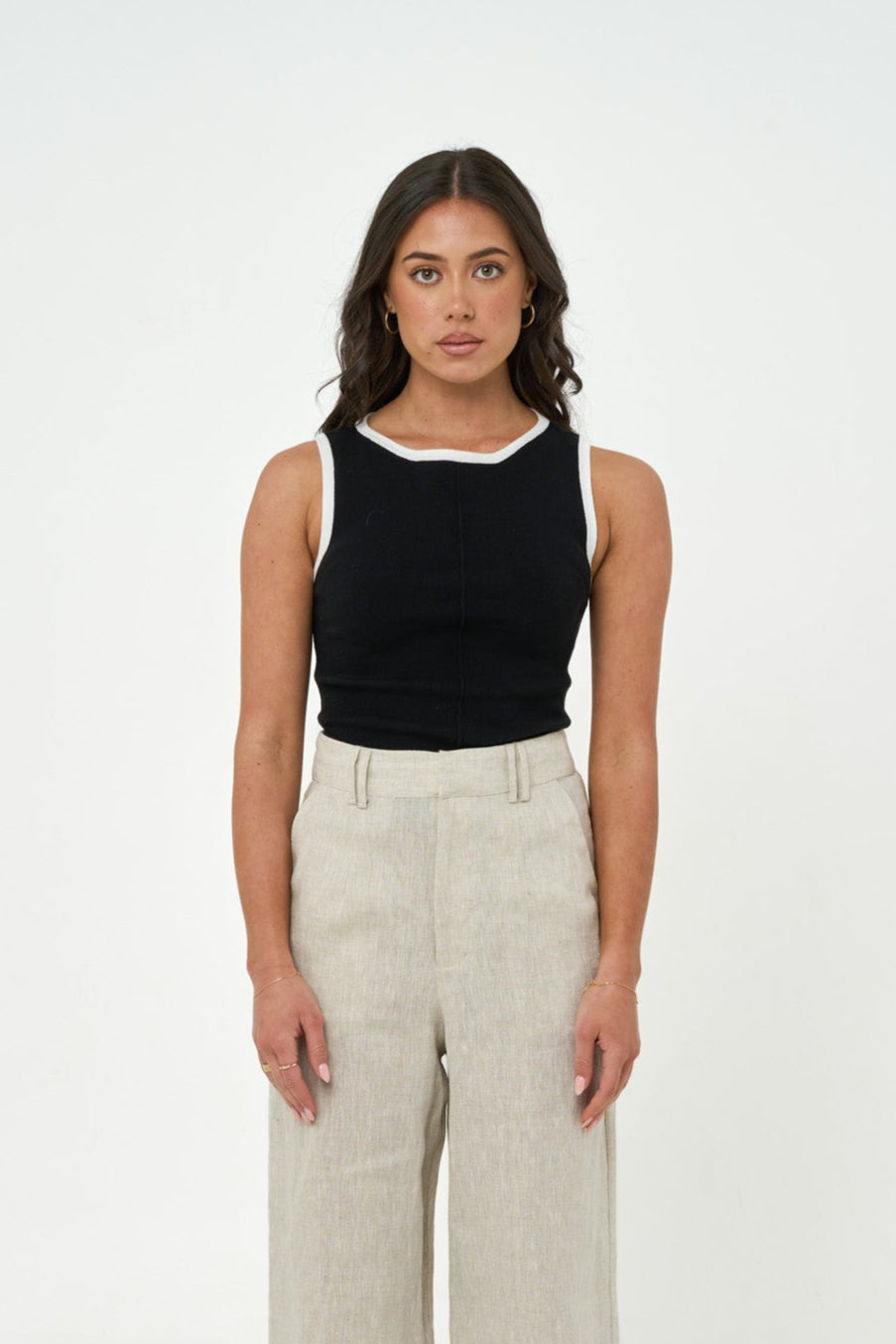 The Alma Tank – a form-fitting knit tank in timeless Black. Made from a heavyweight flat knit rib for subtle structure with high stretch. Features a high boat neckline with white contrast edging, a centre front seam, and a standard length that finishes at the hip. A refined take on the everyday tank.
