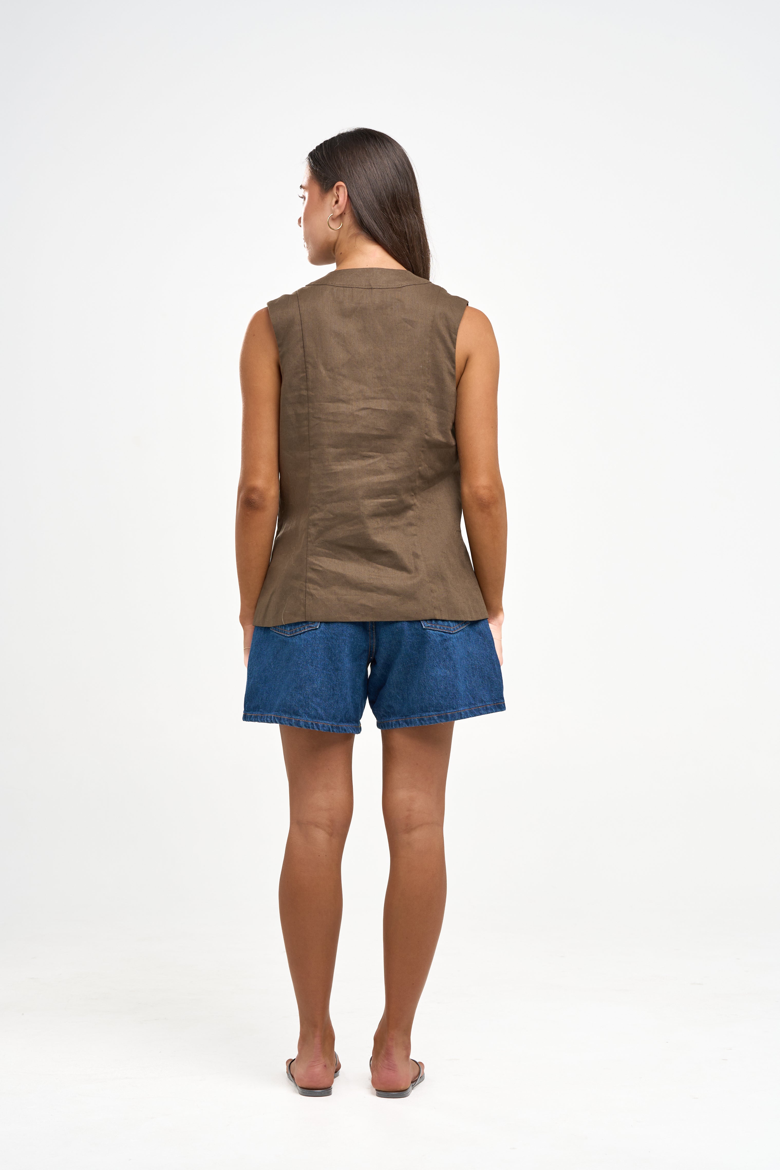 The Finn Vest has been finished on a hemp cotton blend fabric, a tie front, and a long-line design. Its relaxed tailored fit makes it an easy layering piece for any wardrobe. Simple, understated, and versatile.
