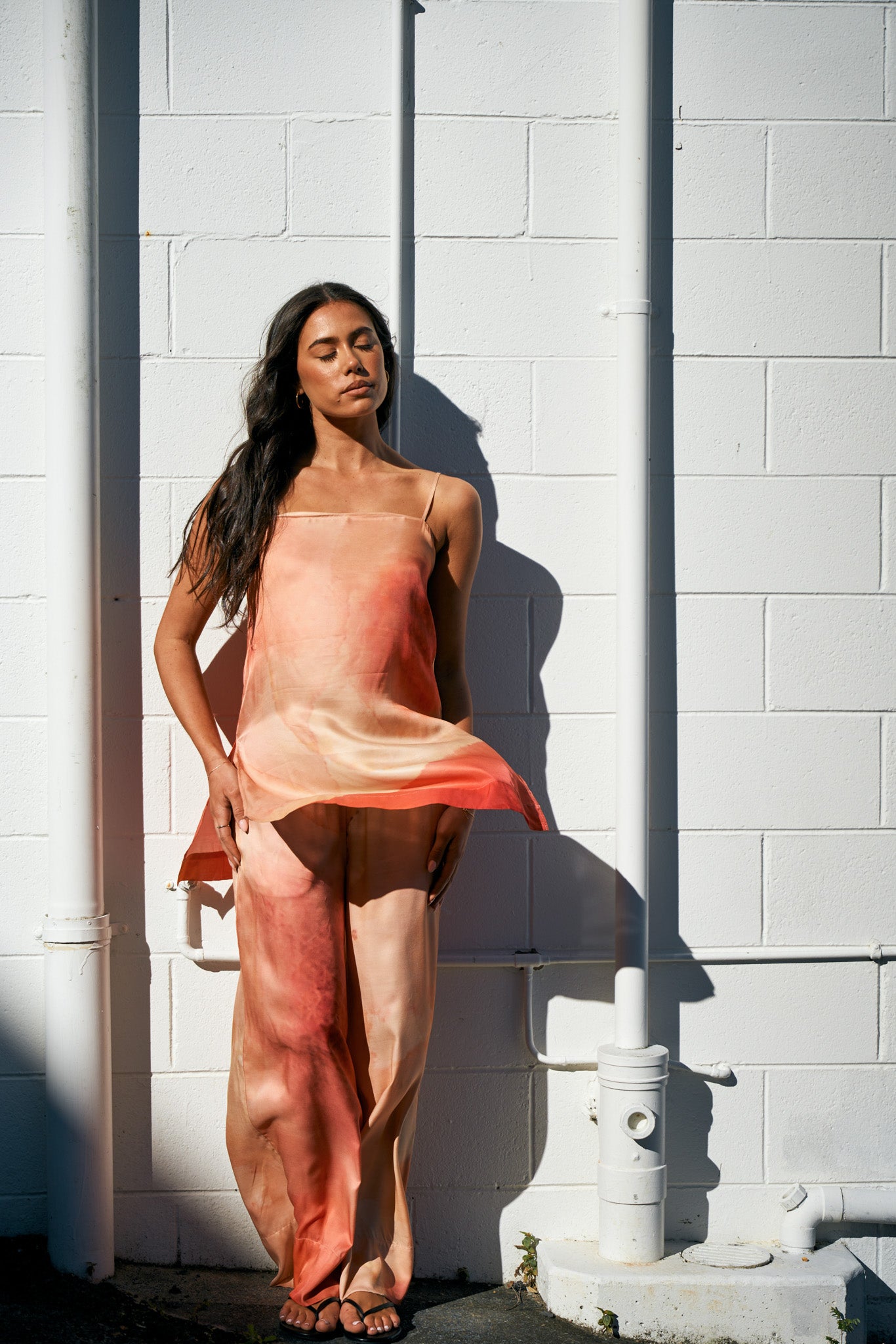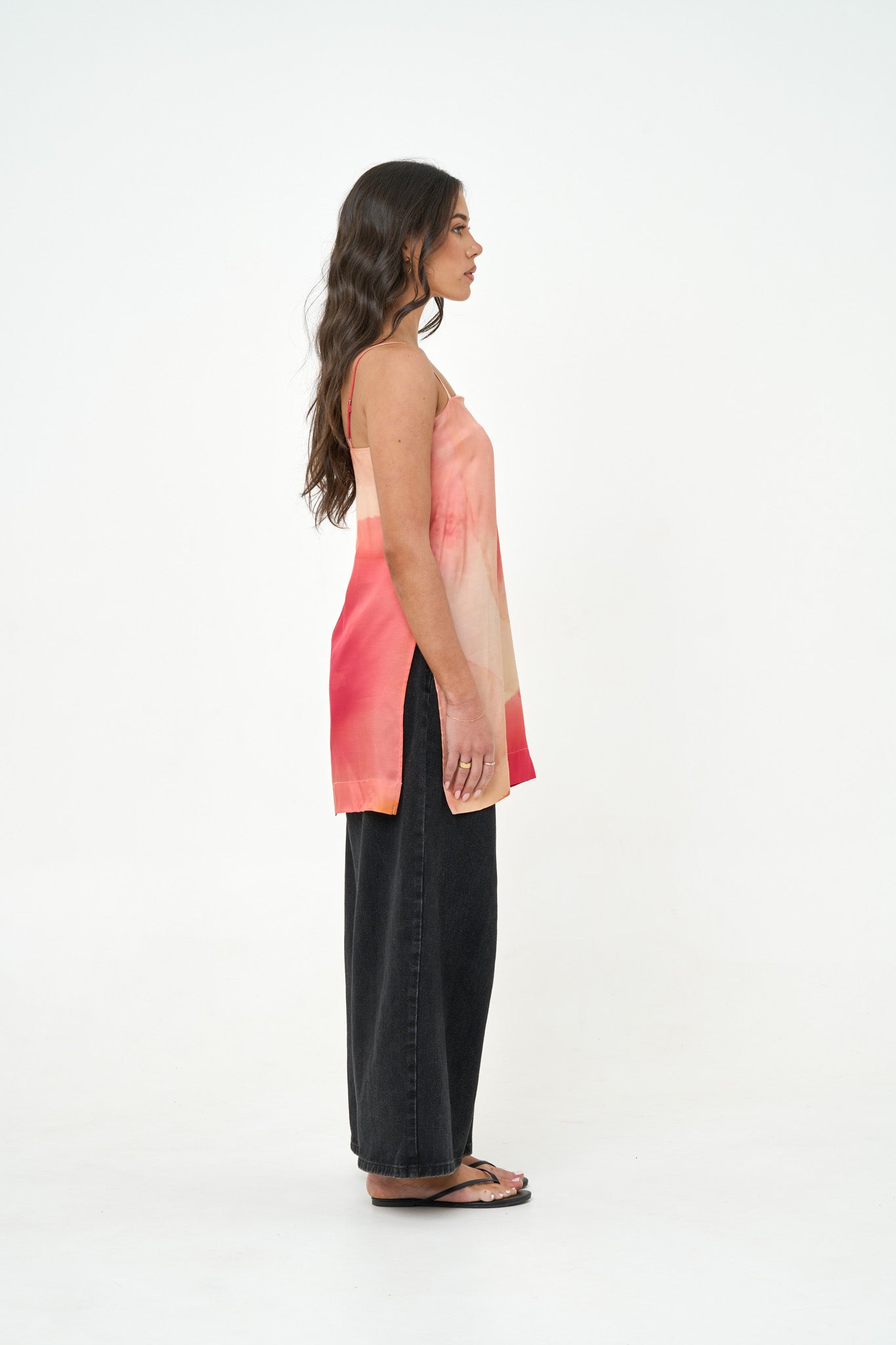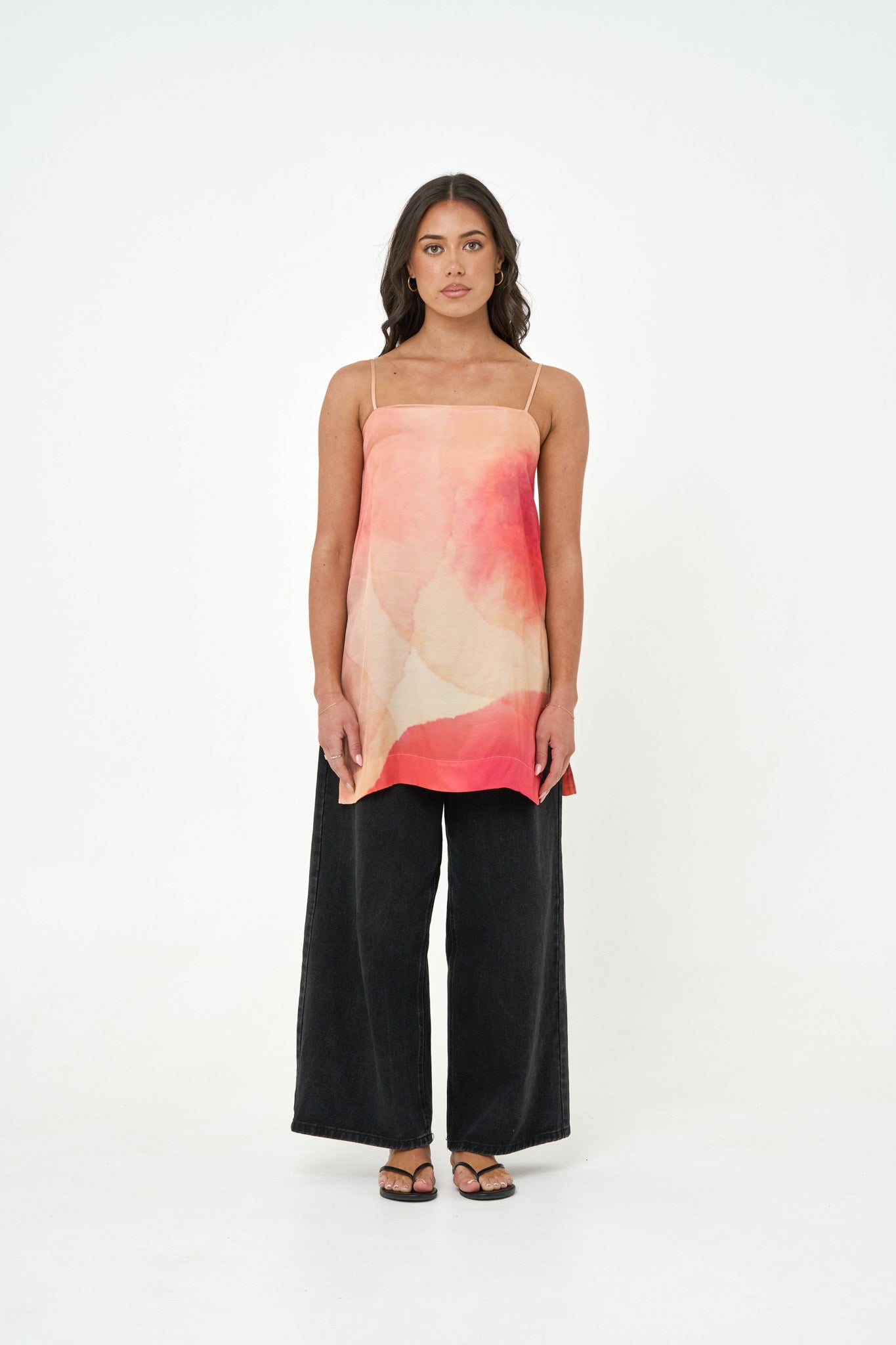 The Lume Tunic Top – a slip silhouette in our hand painted watercolour print. Made from a silky rayon blend fabric that moves with you. Features a straight neckline, adjustable spaghetti straps with a centre back invisibly zipper entry. Finished on a longline design with oversized side splits.