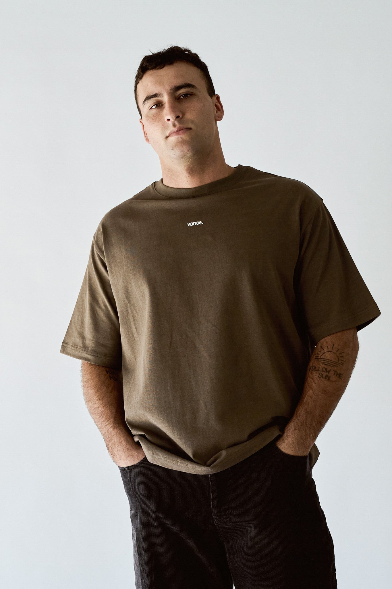 Our Men's VANCE Tee in Cocoa has been made using 100% OE cotton for a premium dry hand feel. It features a minimal front print and a heavy 260gsm fabric weight on our mens oversized tee fit.