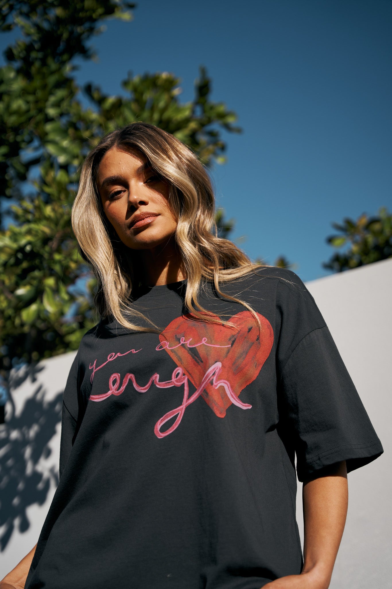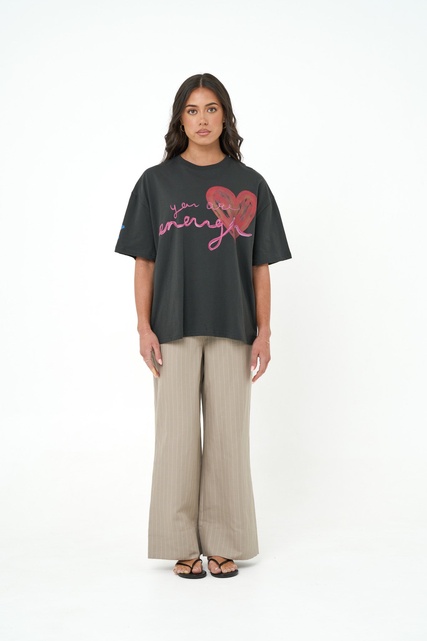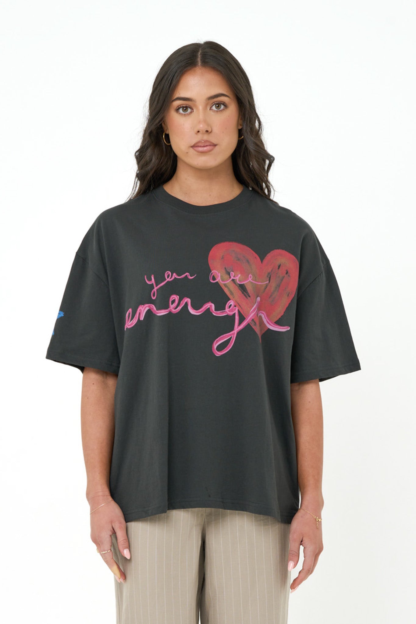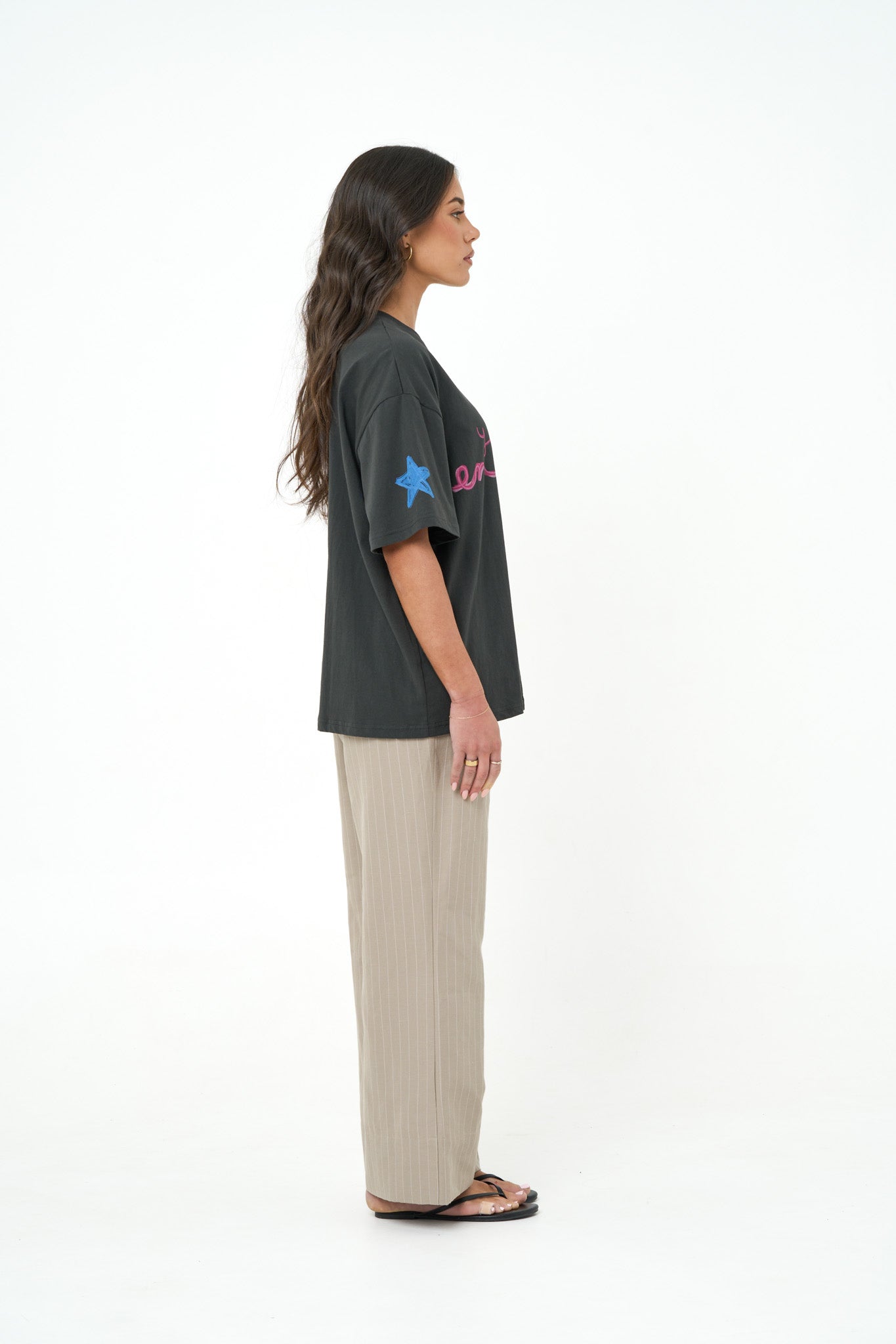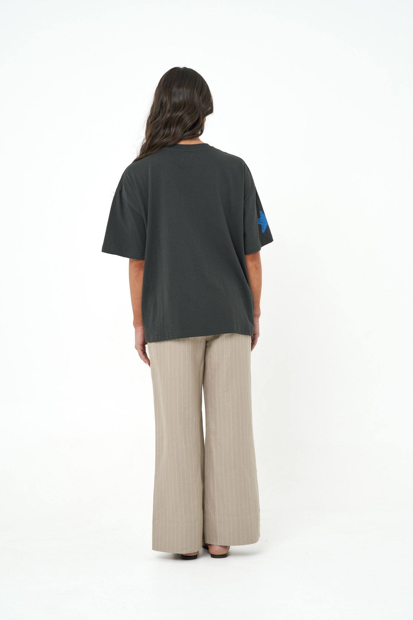 An oversized tee in Off Black, finished with an oversized in-house hand-drawn print on the front. Made from 100% organic cotton for breathability and a kinder footprint. Features a crew neckline, dropped shoulders, with a blue star detail on the wearer's right sleeve. Designed for a relaxed, oversized fit.