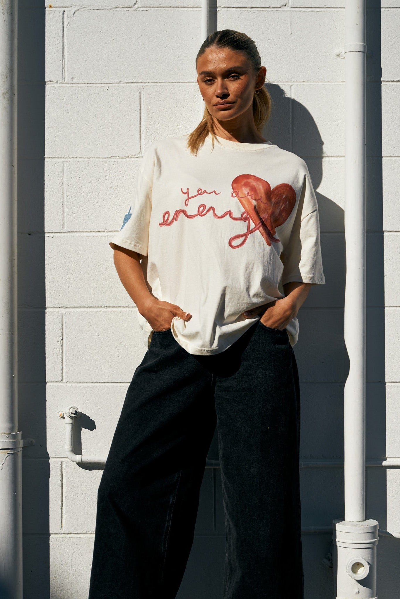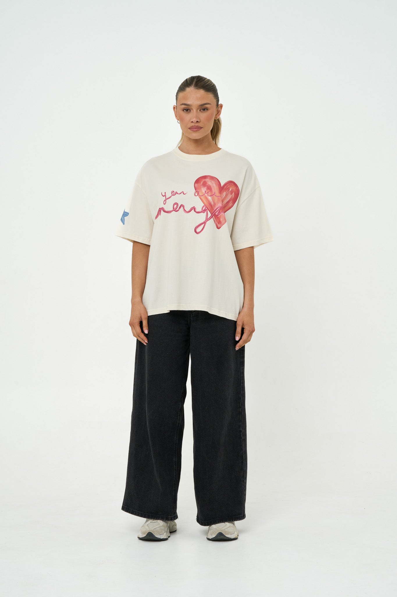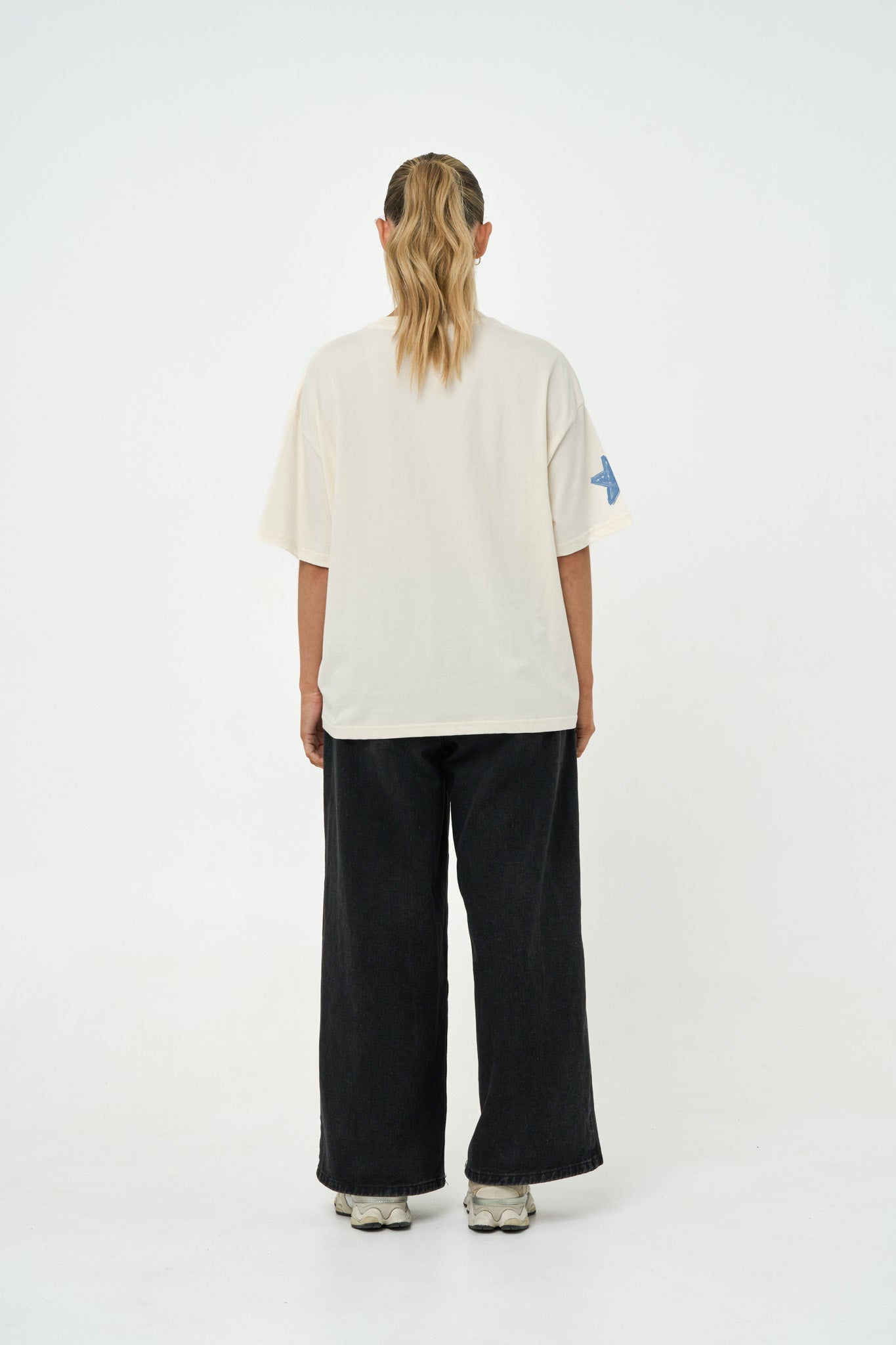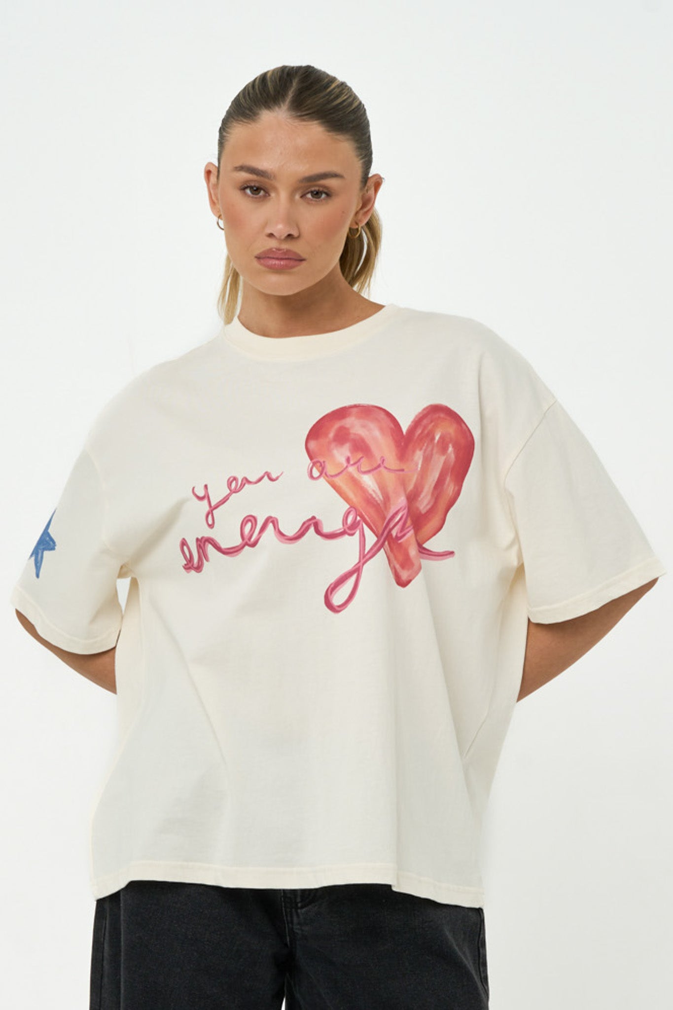 An oversized tee in Off White, finished with an oversized in-house hand-drawn print on the front. Made from 100% organic cotton for breathability and a kinder footprint. Features a crew neckline, dropped shoulders, with a blue star detail on the wearer's right sleeve. Designed for a relaxed, oversized fit.